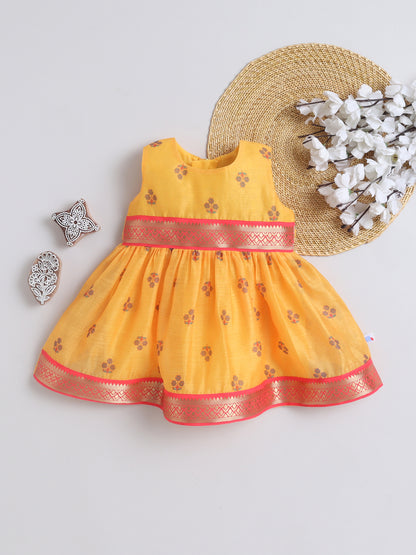 Many Frocks & Chanderi Sleeveless Lace Embellished Knee Length Flared Baby Girls Ethnic Dress - Mustard