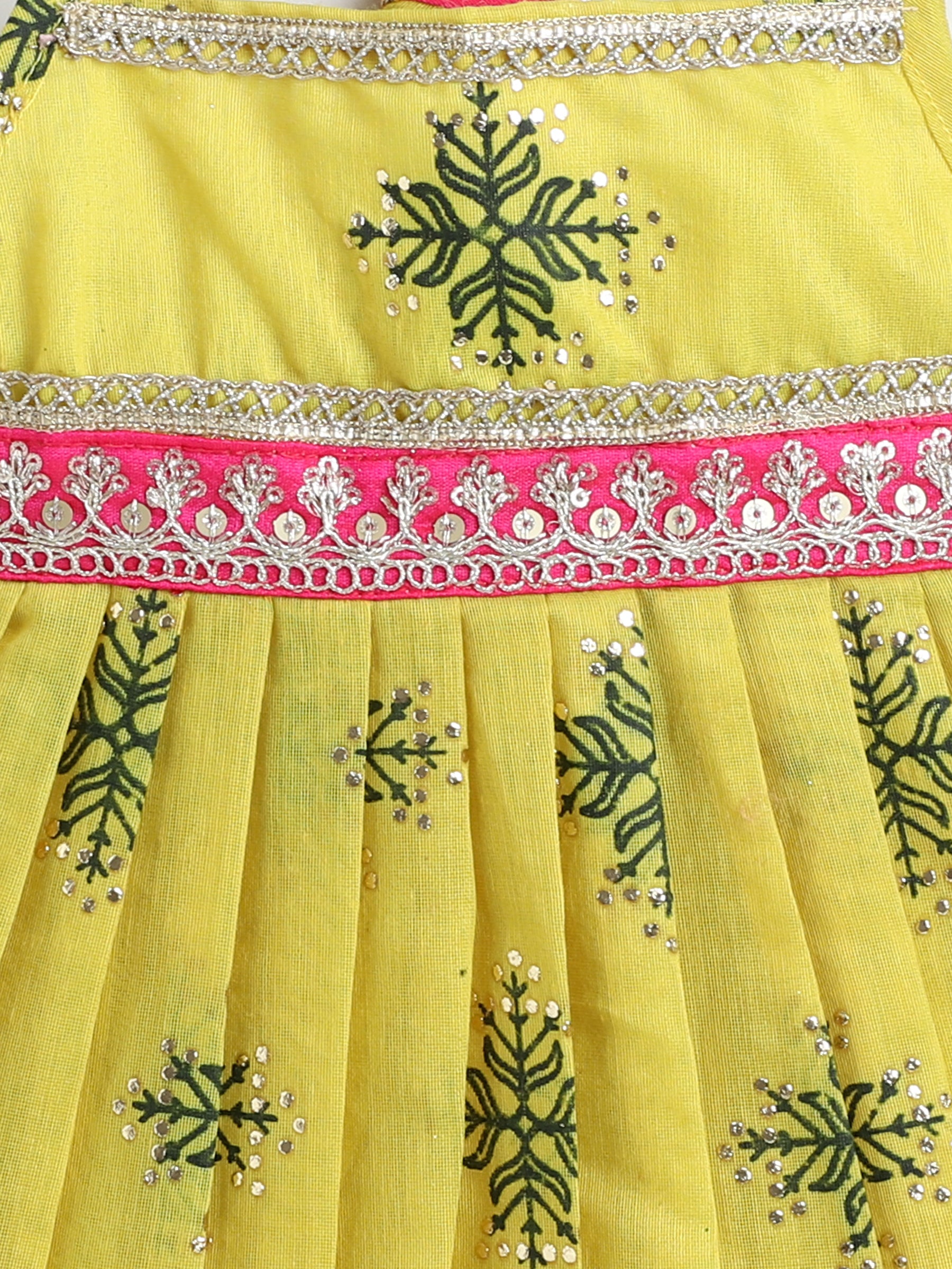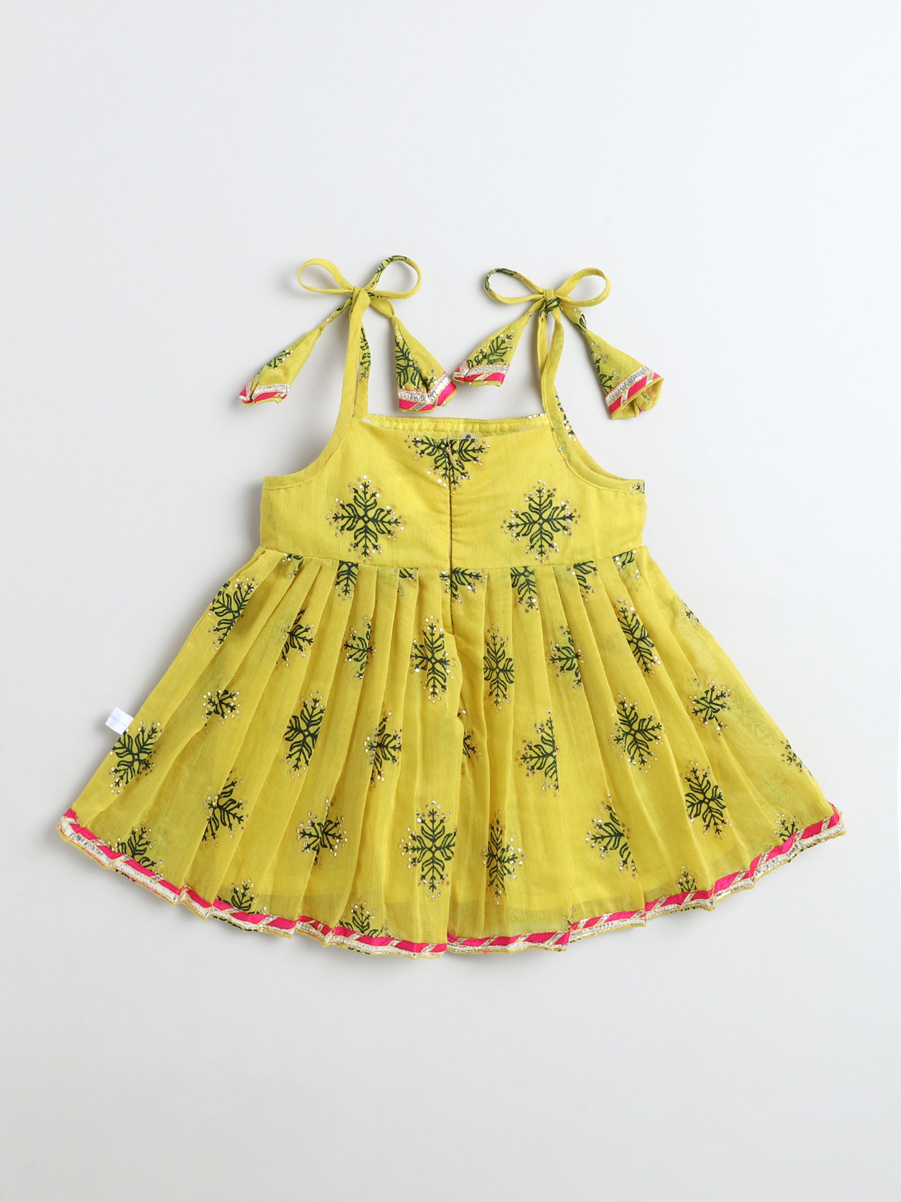 Many Frocks & Chanderi Sleeveless Lace Embellished Knee Length Flared Baby Jhabla Ethnic Dress - Yellow