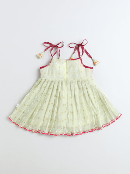 Many Frocks & Chanderi Sleeveless Lace Embellished Knee Length Flared Jhabla Baby Girls Ethnic Dress - Mint Green & Pink