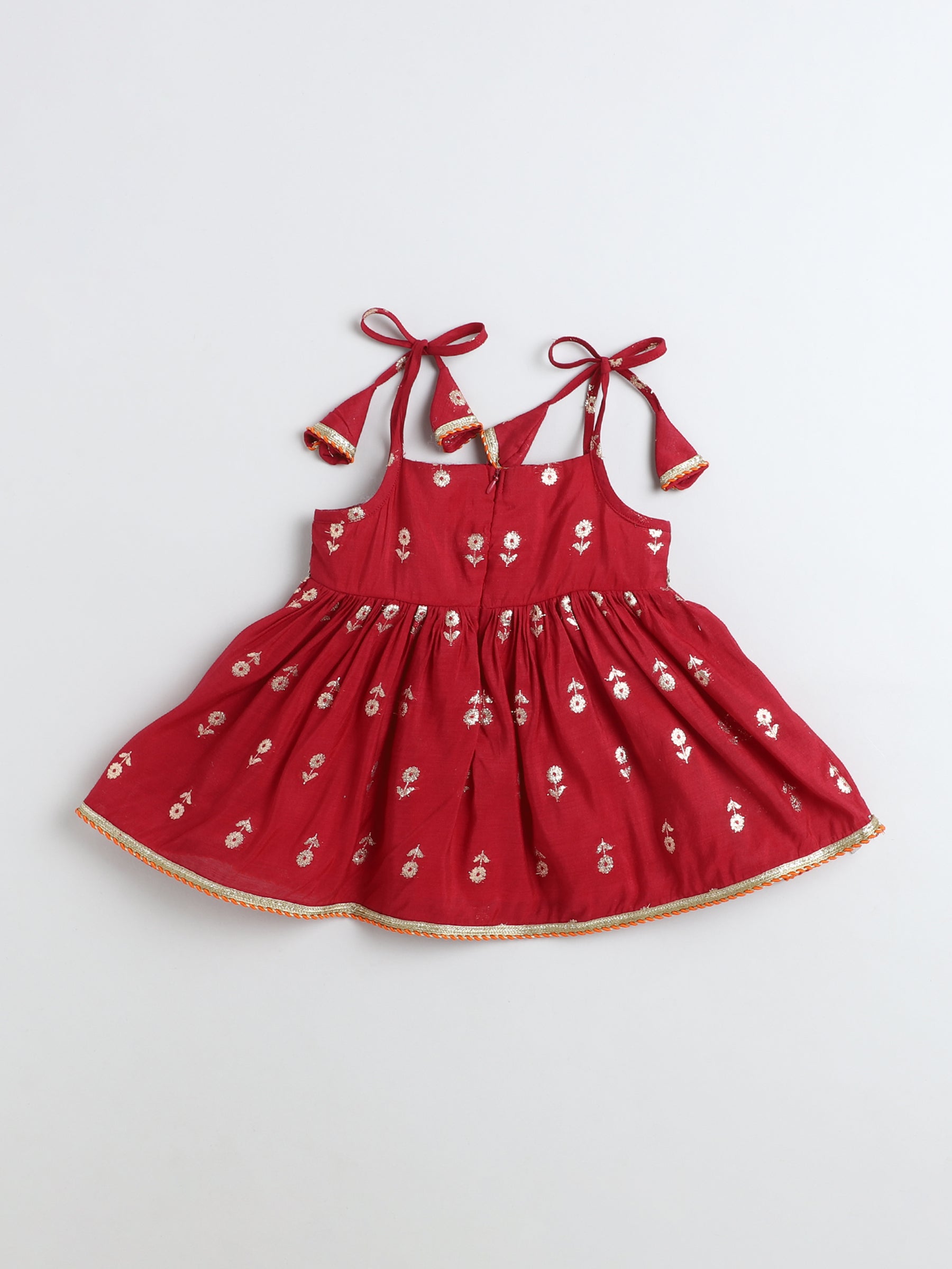 Many Frocks & Cotton golden flower woven Lace Embellished Knee Length Flared Baby Girls Jhabla Ethnic Dress - Maroon