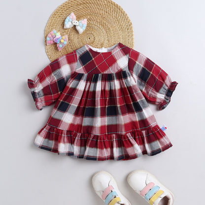 Many Frocks & Cotton Short Sleeves Checks Printed Knee Length Flared A Line Girls Christmas Casual Dress -Maroon