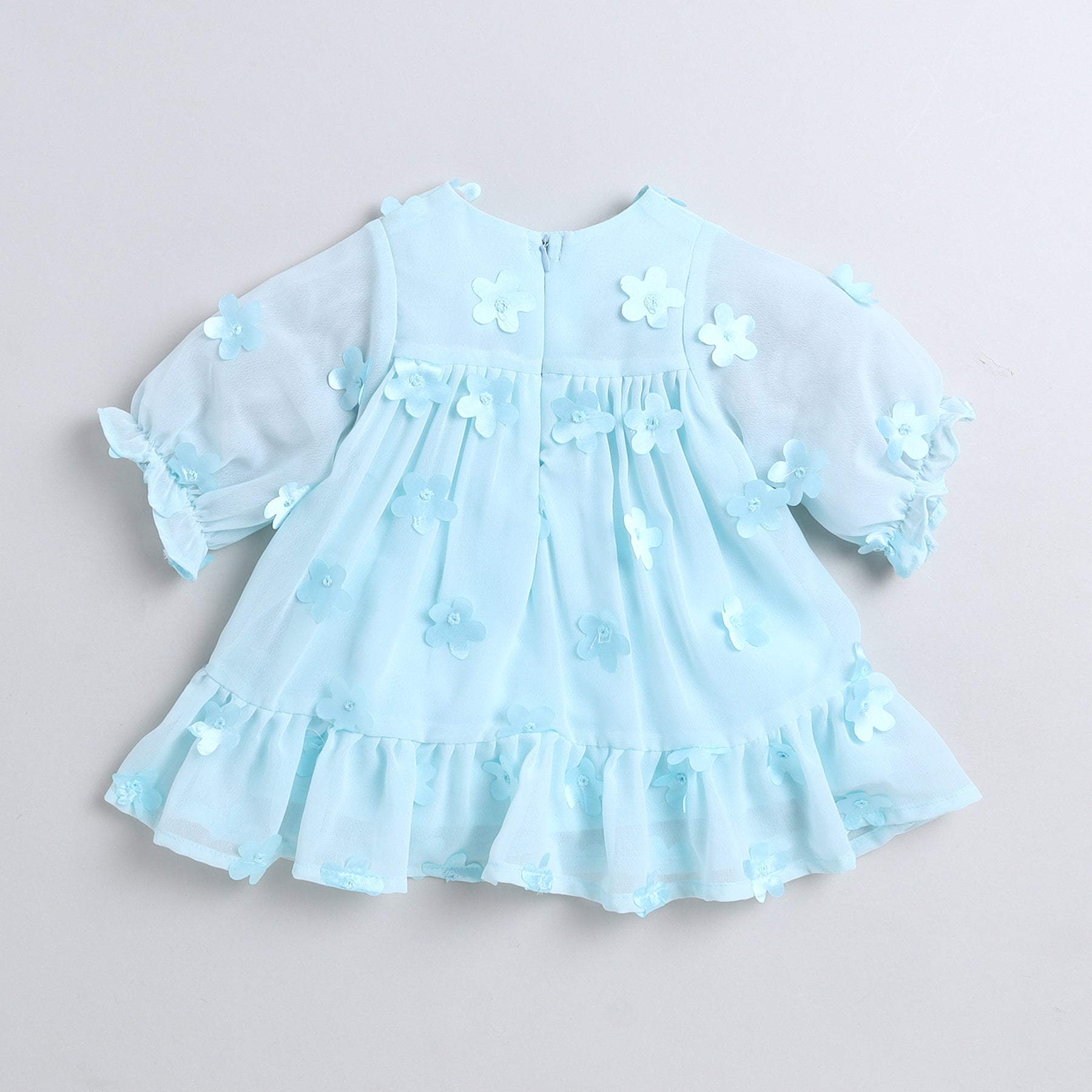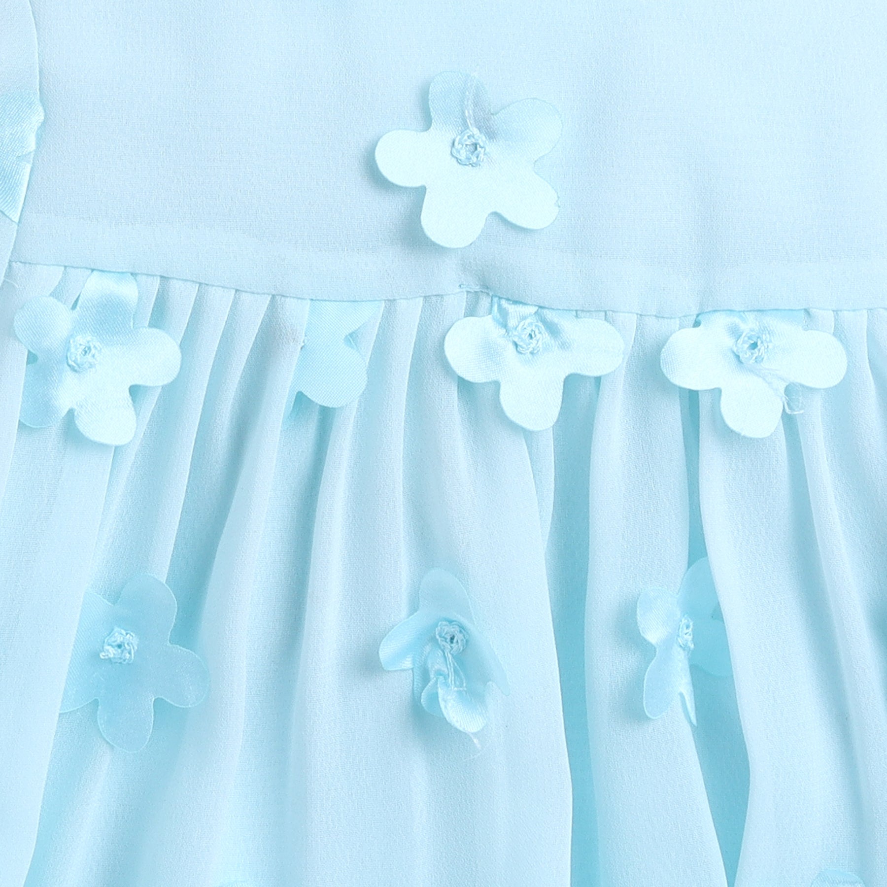 Many Frocks & Georgette Short Sleeves 3D Flower Embellished Knee Length Flared A Line Girls Christmas Party Dress - Light Blue