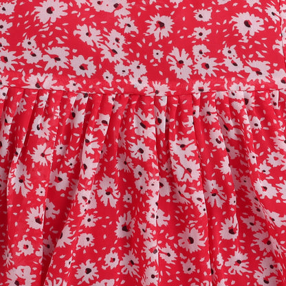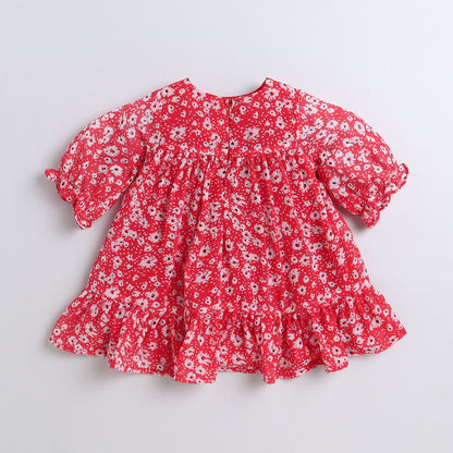 Many Frocks & Georgette Short Sleeves Floral Printed Knee Length Flared A Line Girls Christmas Casual Dress -Red