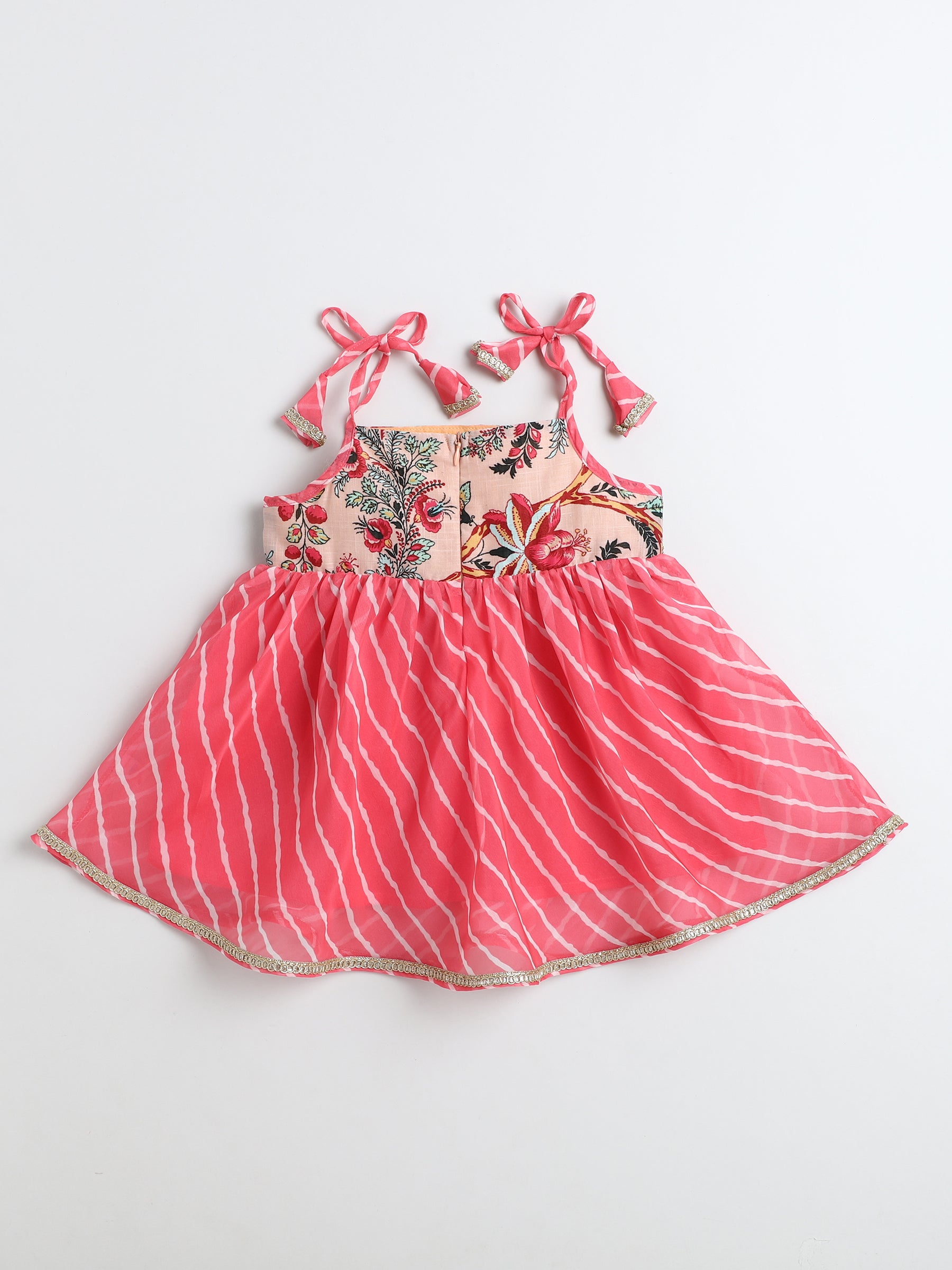 Many Frocks & Georgette Sleeveless Lace Embellished Printed Knee Length Flared Baby Girls Jhabla Ethnic Dress - Pink