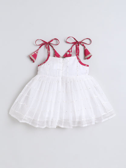 Many Frocks & Malmal Cotton Sleeveless Tie-Up Shoulder Straps Lace Embellished Knee Length Flared Baby Girls Ethnic Dress - White & Pink