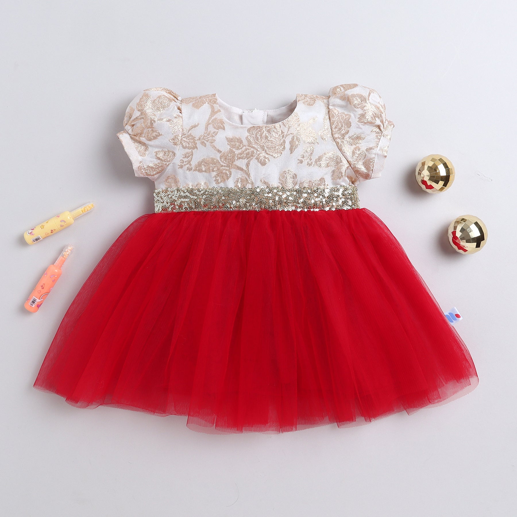 Many Frocks & Net Puff Sleeves Sequin Lace Embellished Knee Length Flared Girls Christmas Party Dress - Red & Cream