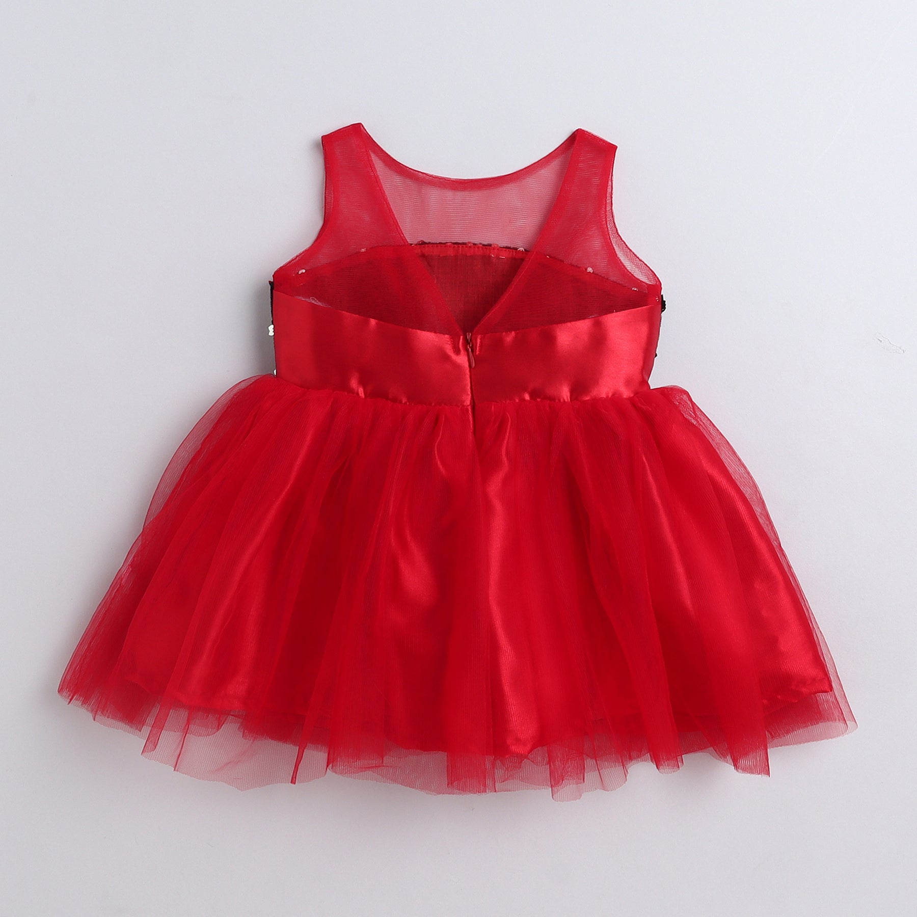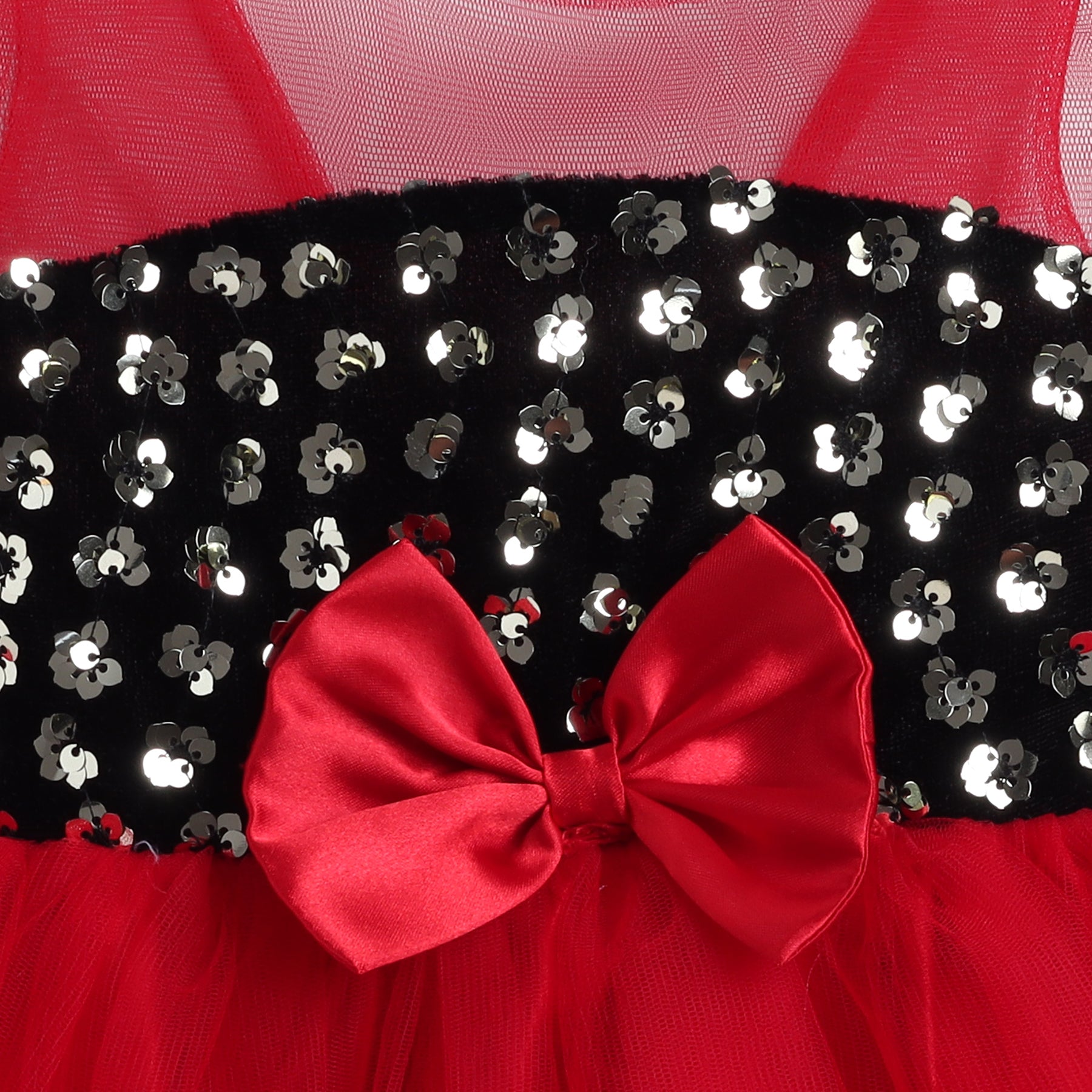 Many Frocks & Net Sleeveless Bow Embellished Knee Length Flared Girls Christmas Party Dress - Red & Black