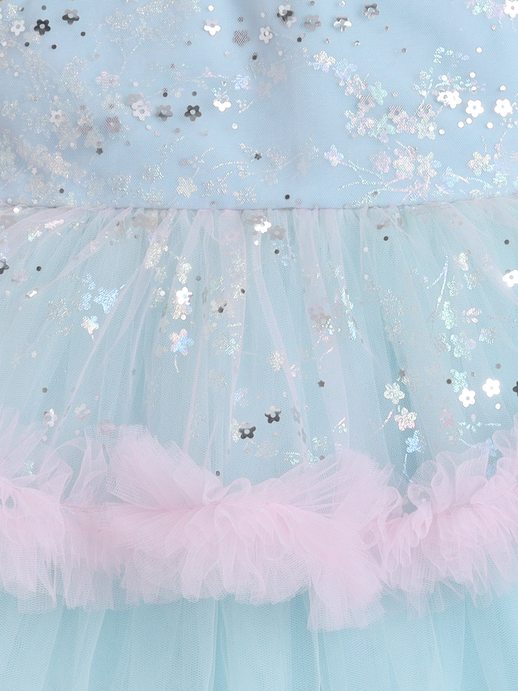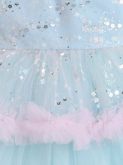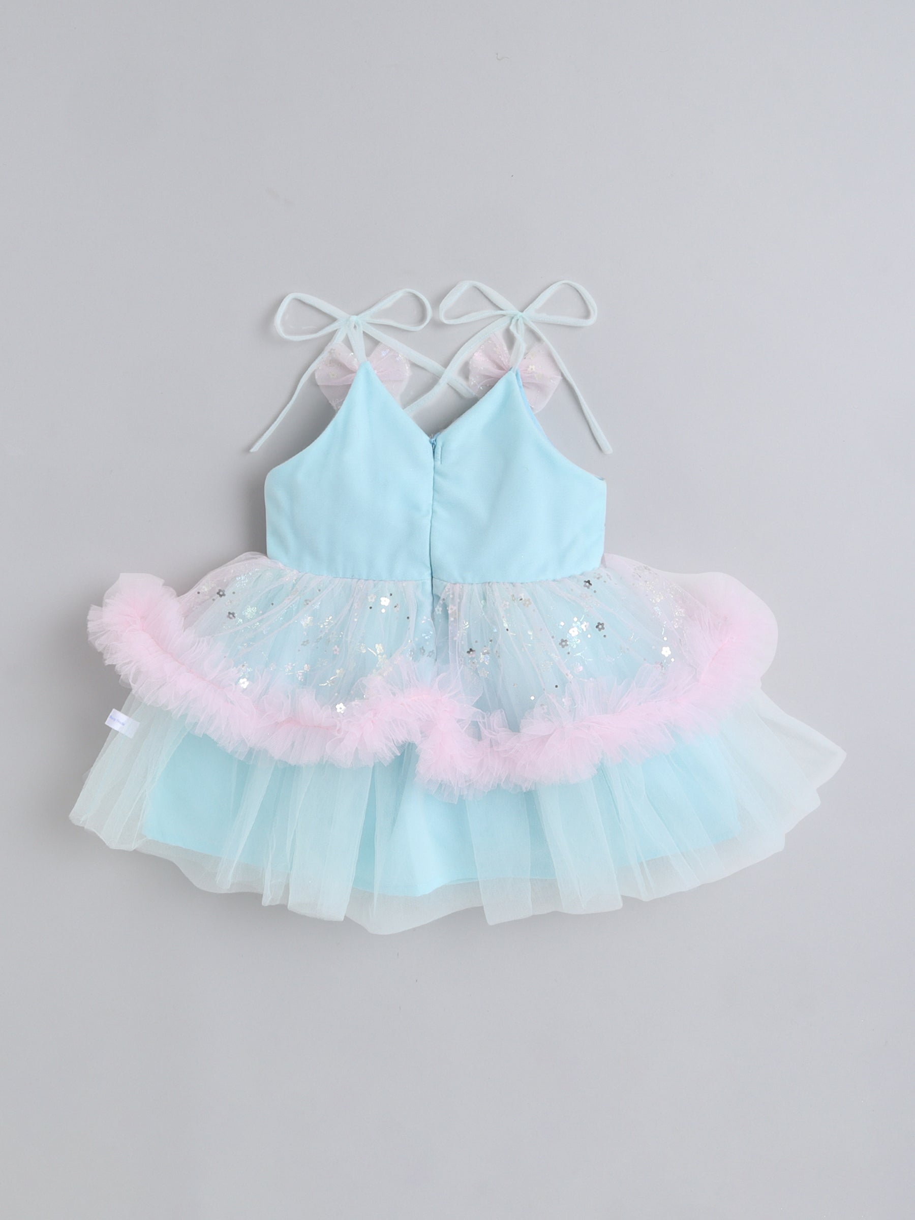 Many Frocks & Net Sleeveless Tie-Up Shoulder Straps Star Printed Bow Embellished Knee Length Baby Girl Party Dress - Blue