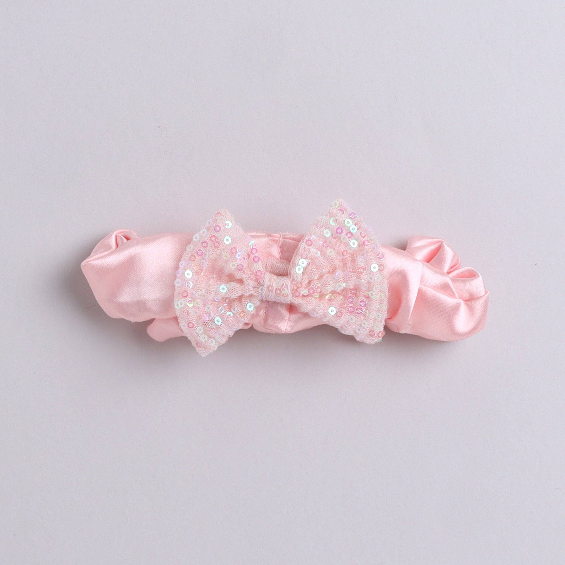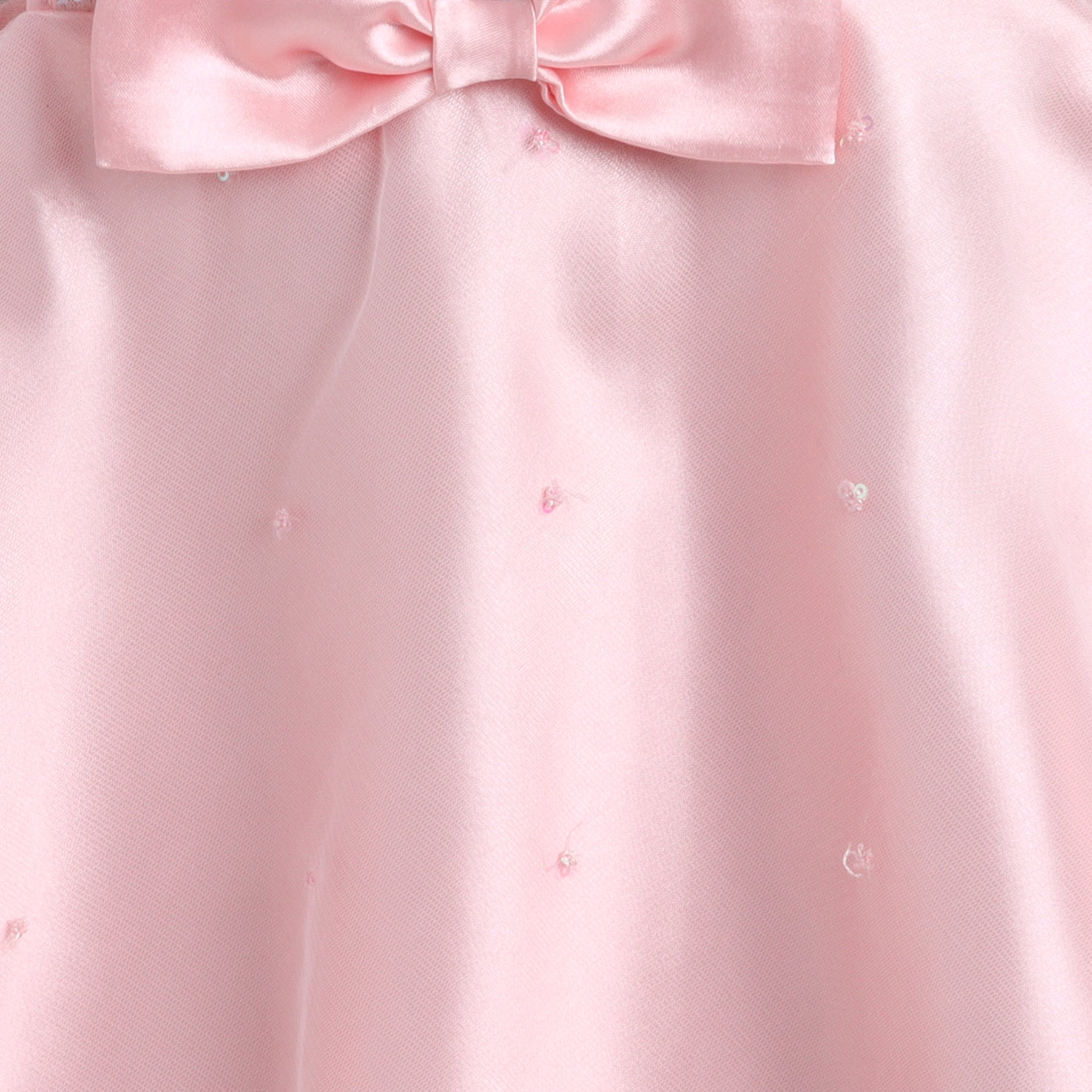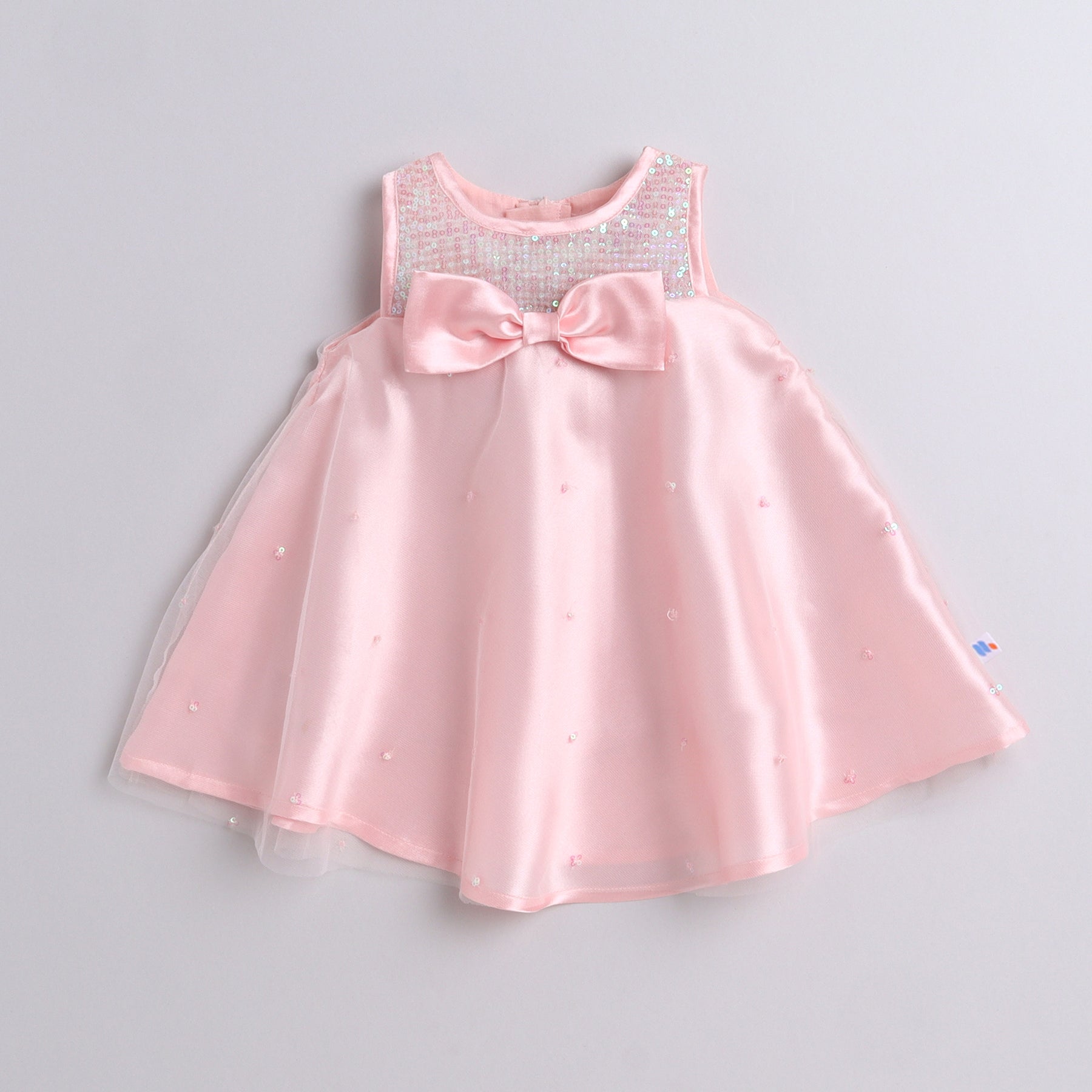 Many Frocks & satin and net sleeveless big bow embellished baby party dress mittens booties and headband - Pink