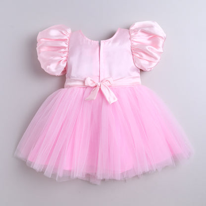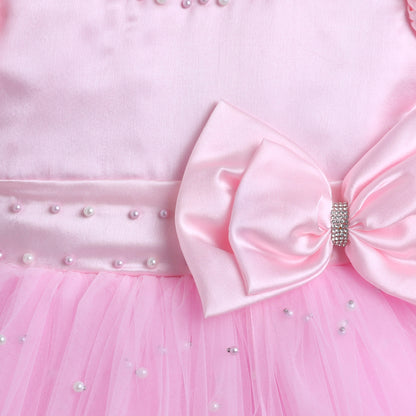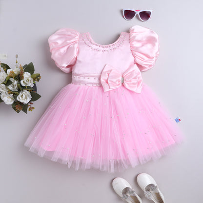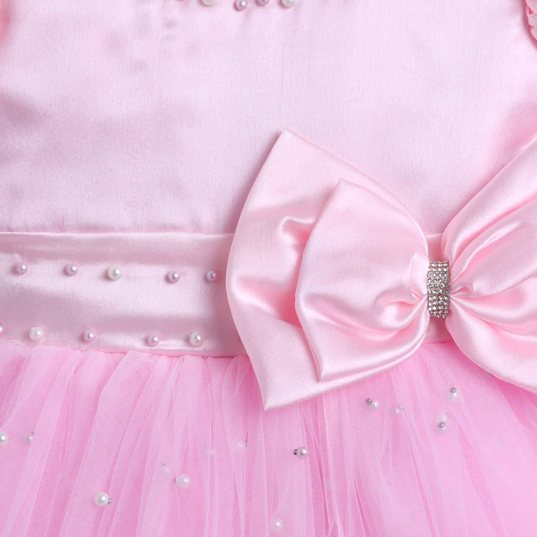 Many Frocks & Satin Balloon Sleeve Double Bow and Pearl Embellished Party Dress - Pink