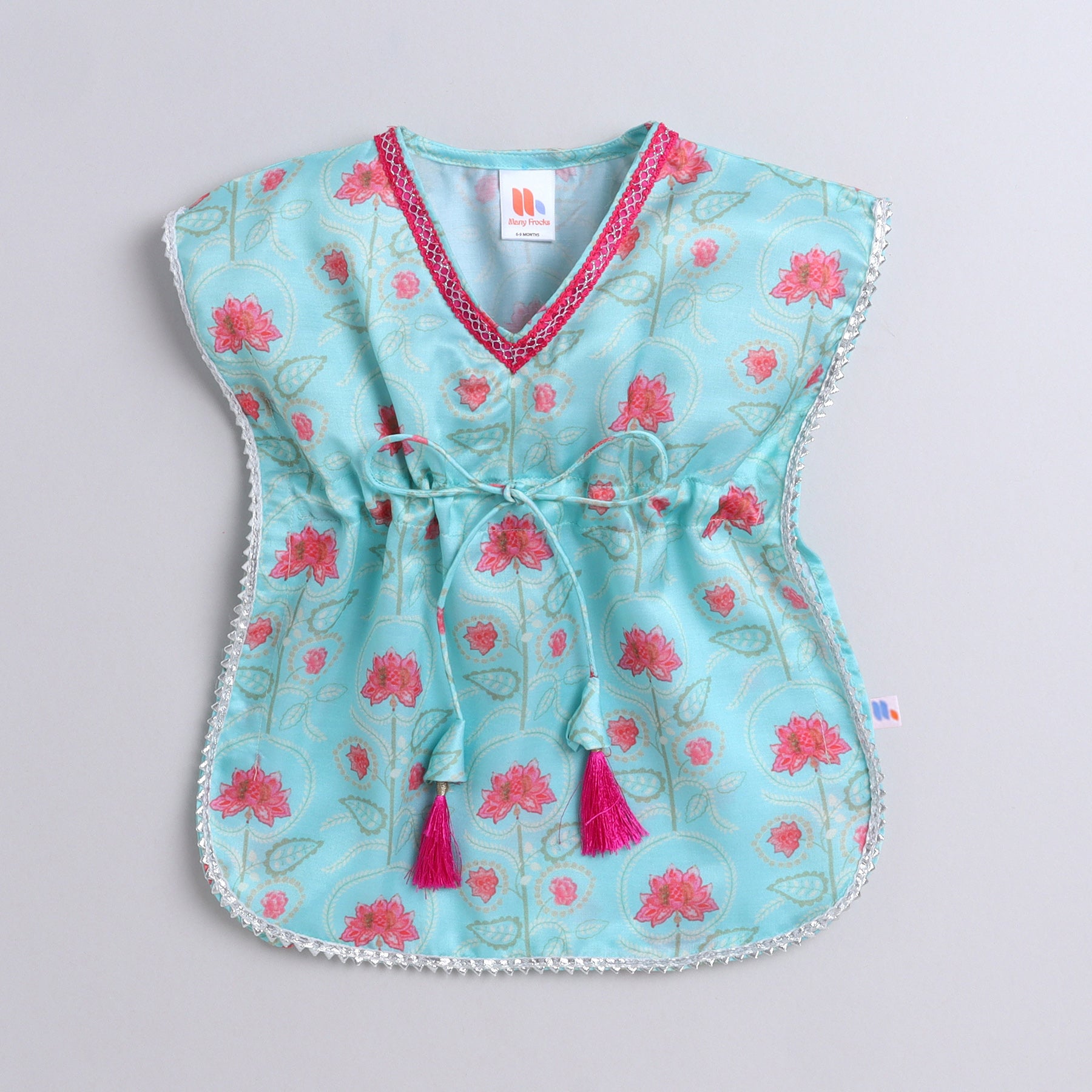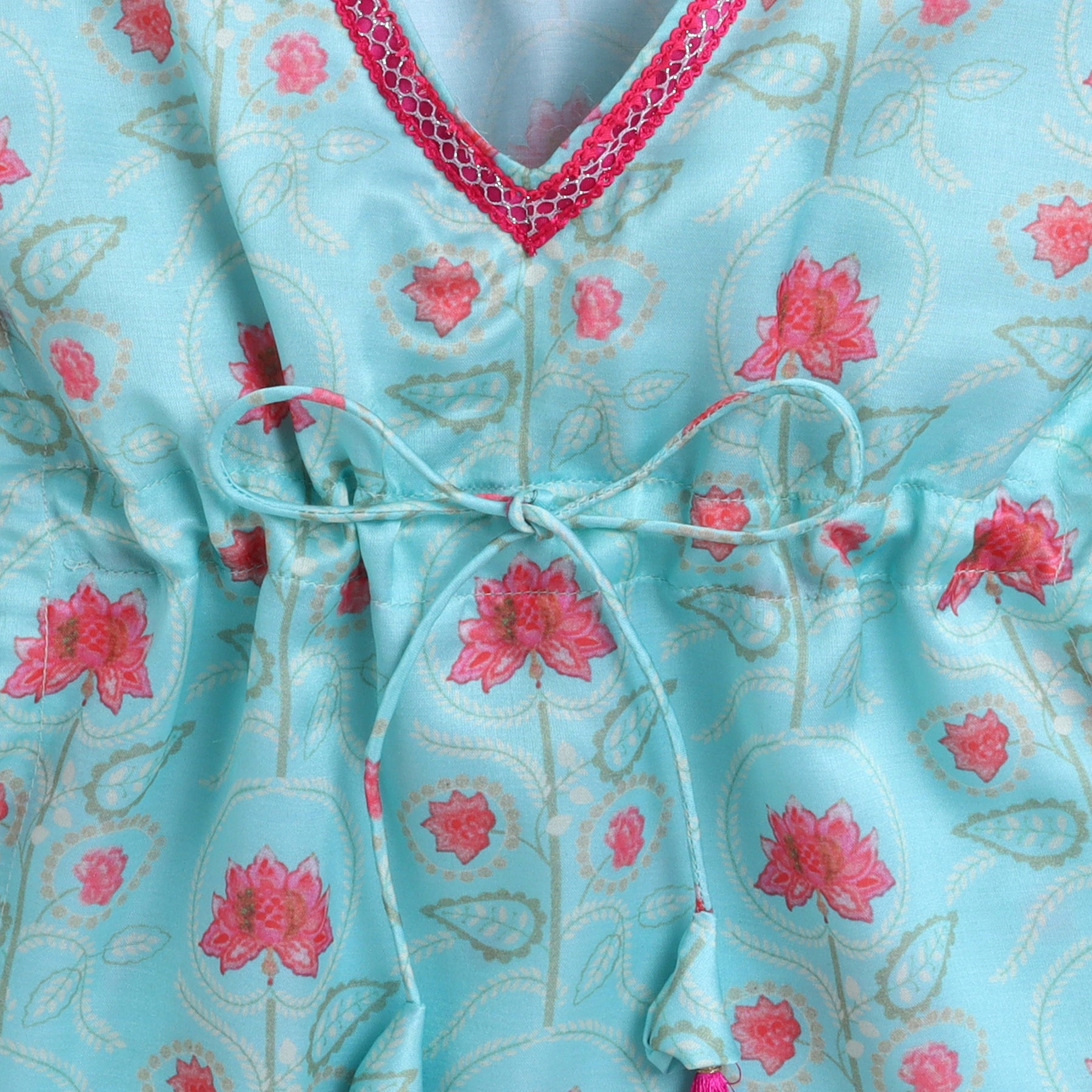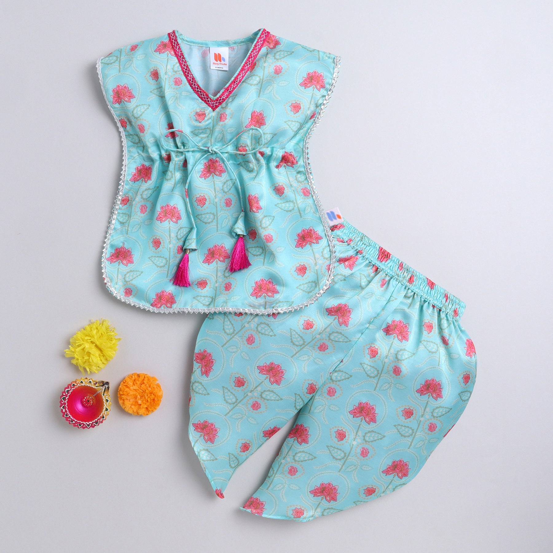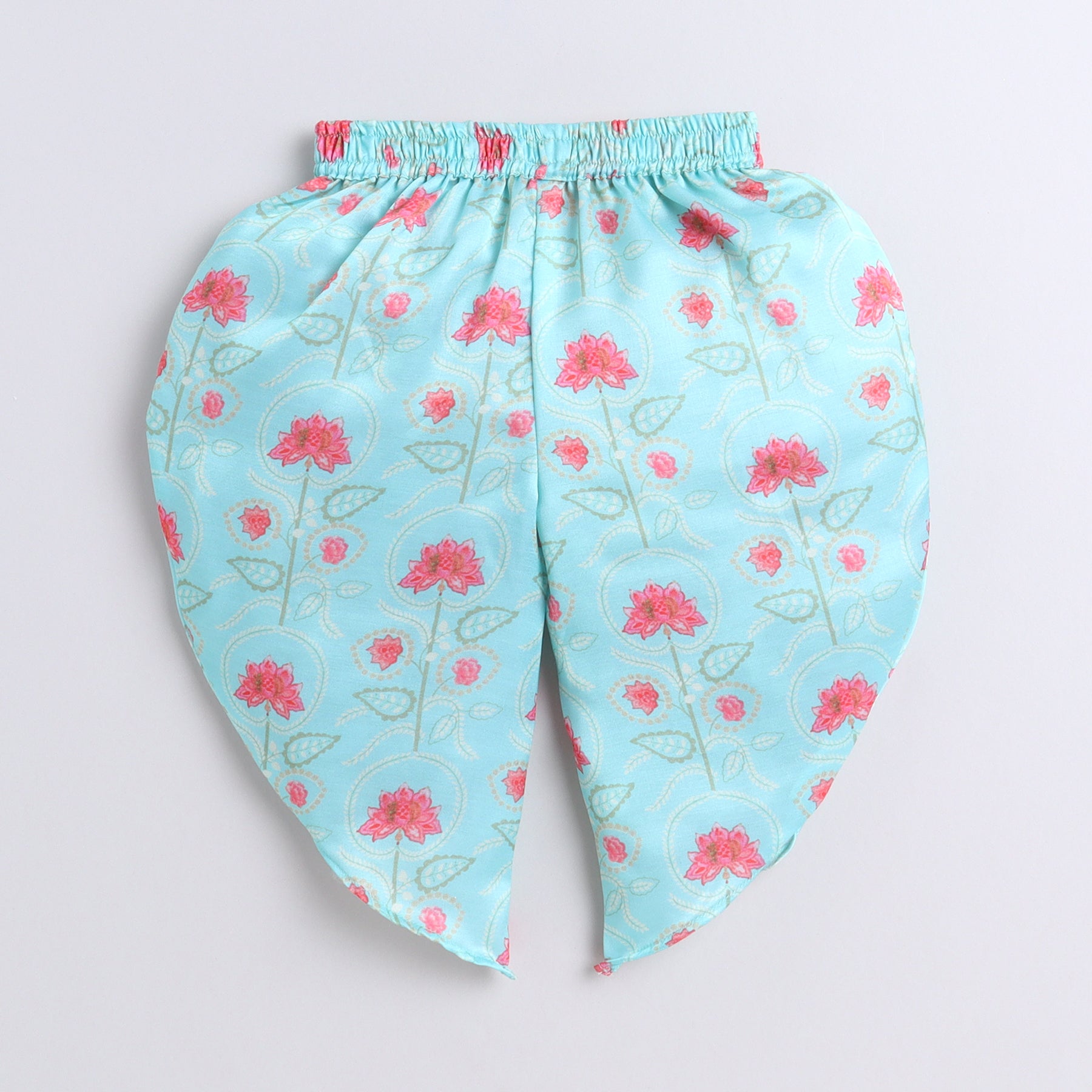 Many Frocks & satin kaftan top with floral printed dhoti ethnic set- sea green
