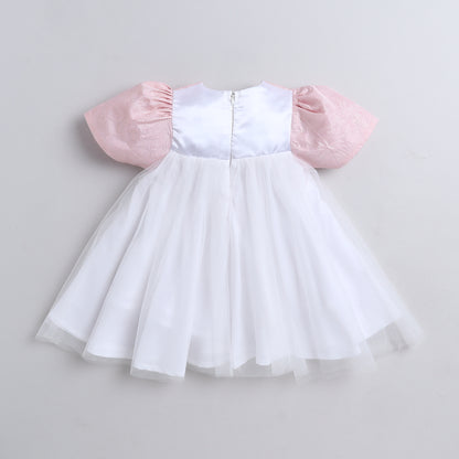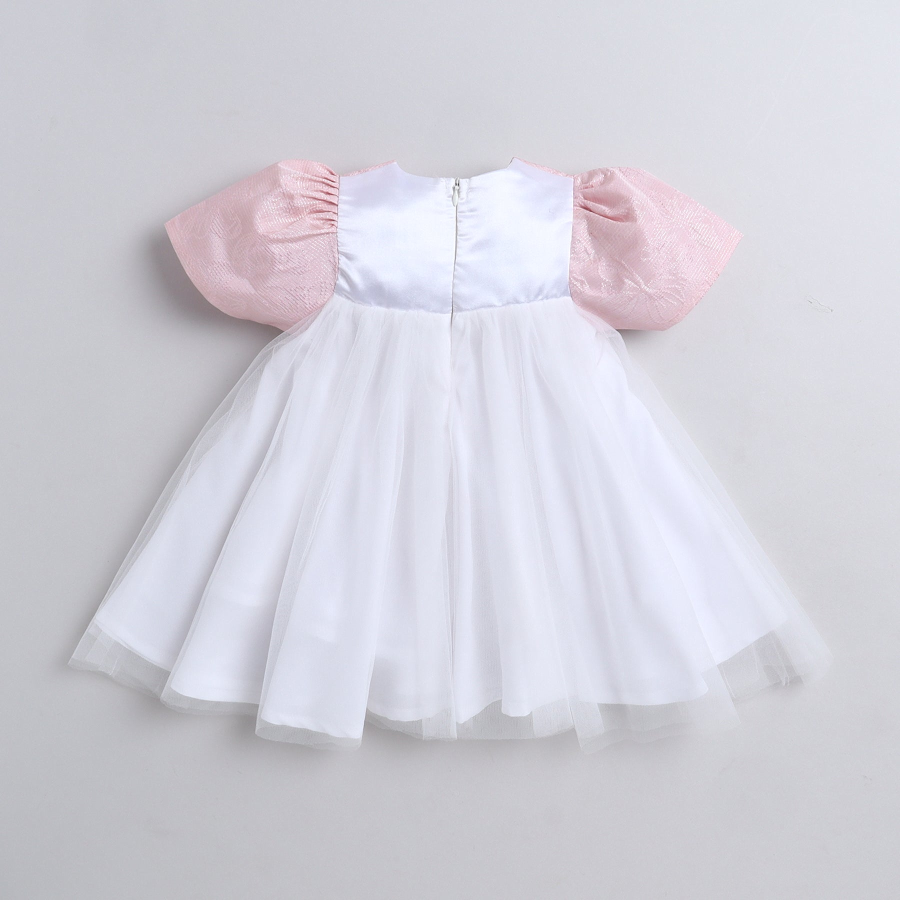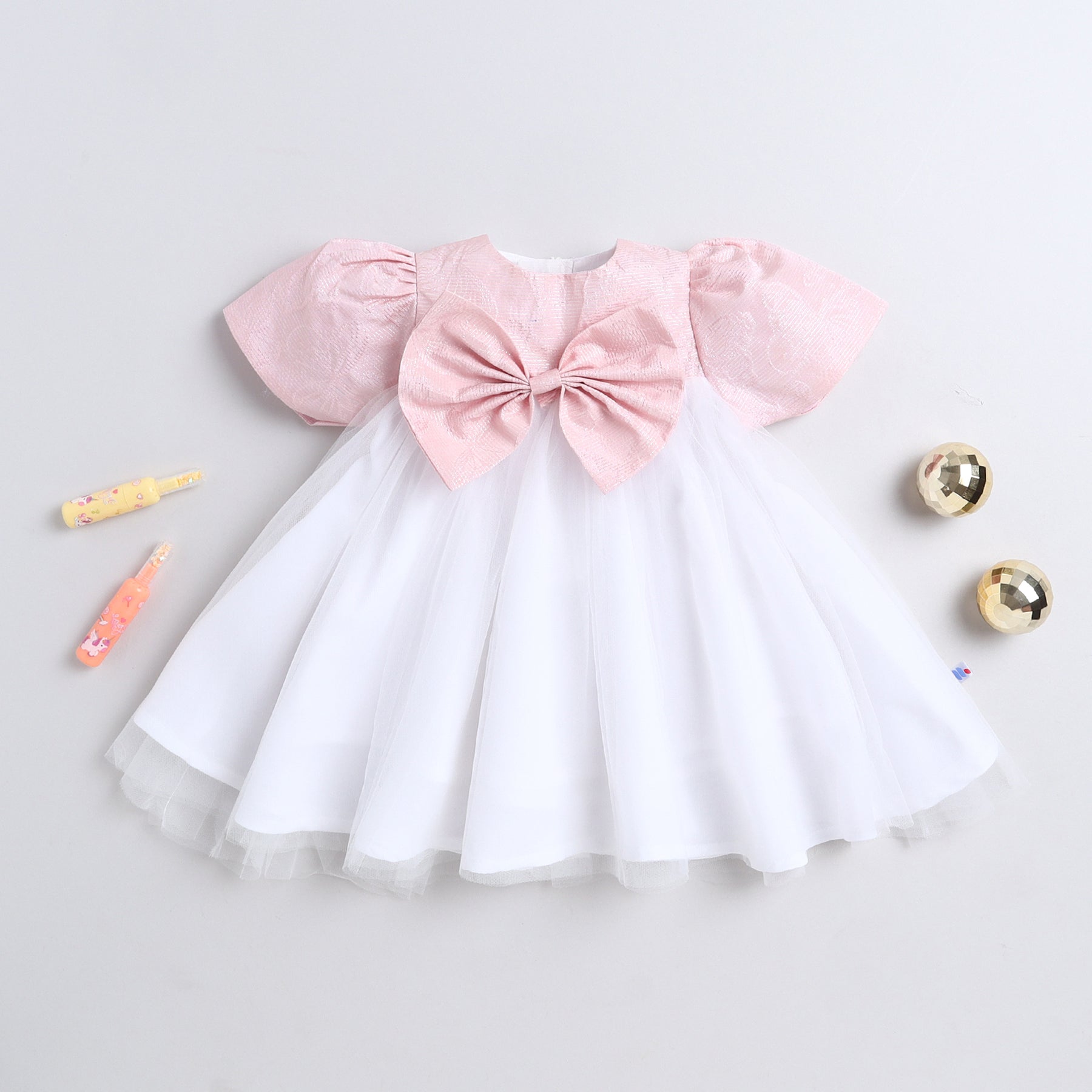 Many Frocks & Sleeveless Bow Embellished Knee Length Flared Girls Christmas Party Dress -Pink & White