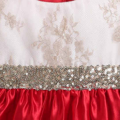 Many Frocks & Sleeveless Sequin Lace Embellished Knee Length Flared Girls Christmas Party Dress - Red & Cream