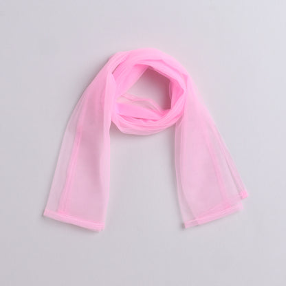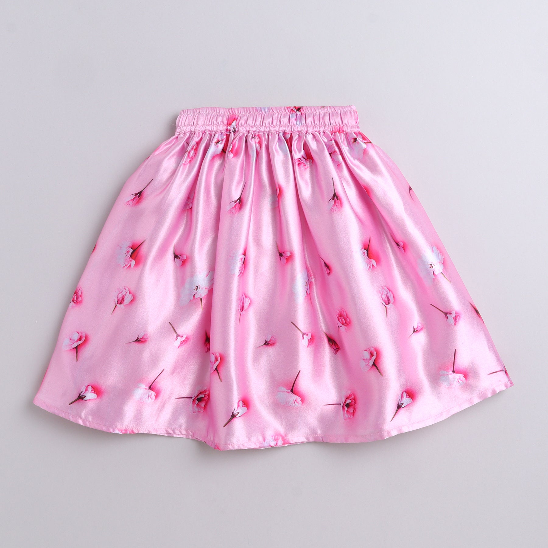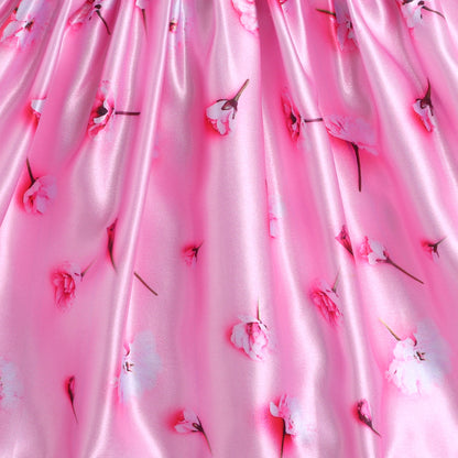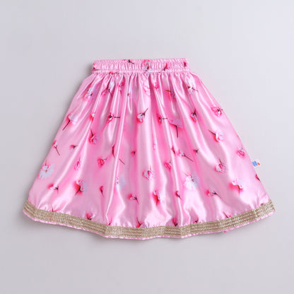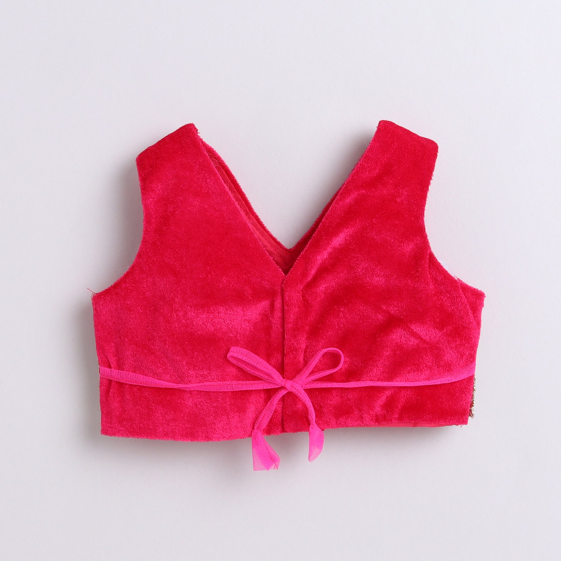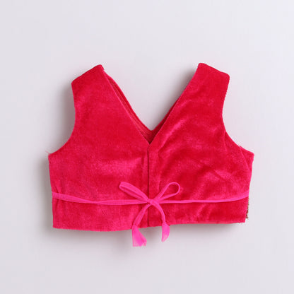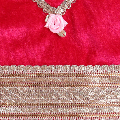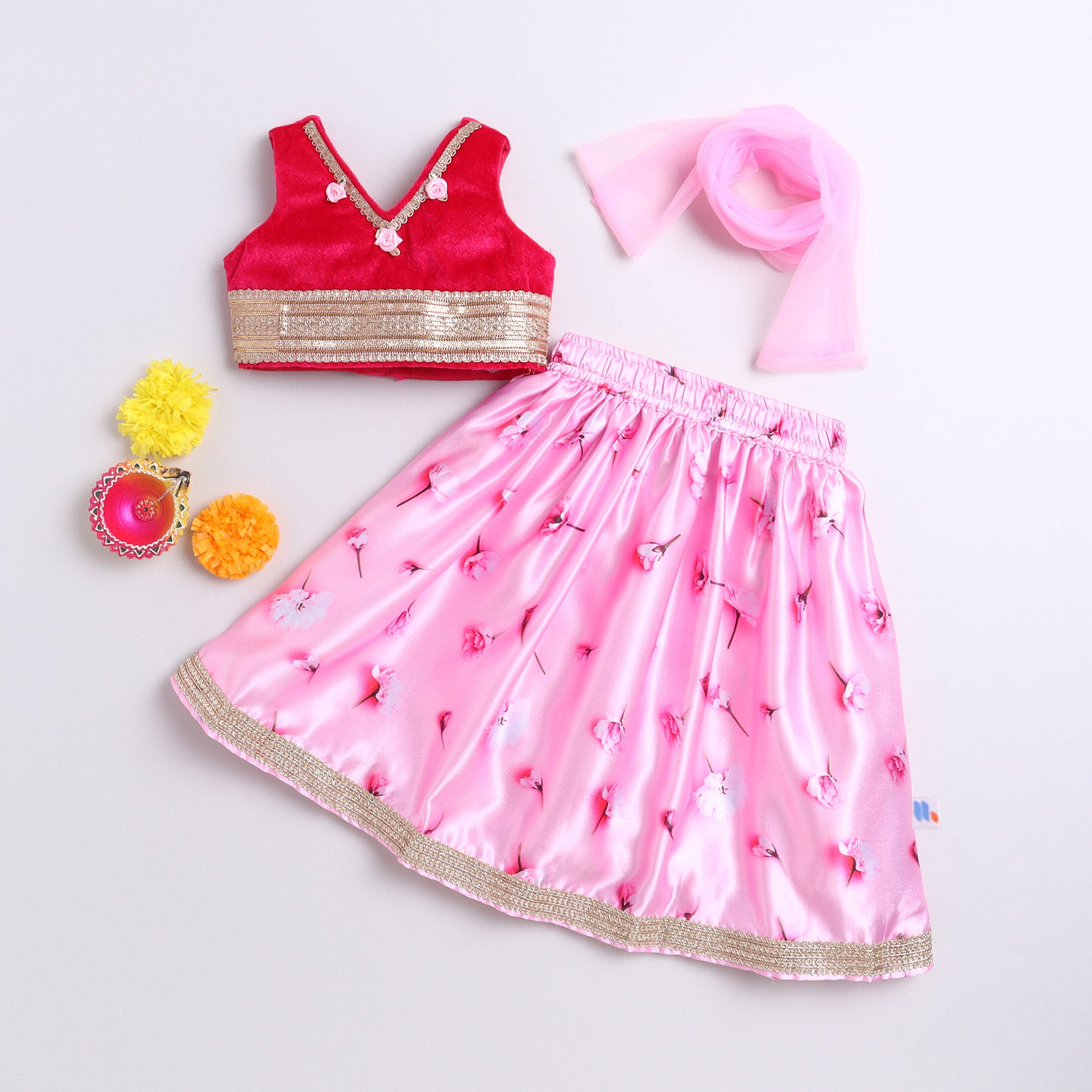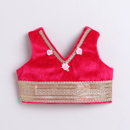 Many Frocks & velvet and satin sleeveless lace & handmade rose embellished floral printed lehenga choli dupatta set-pink