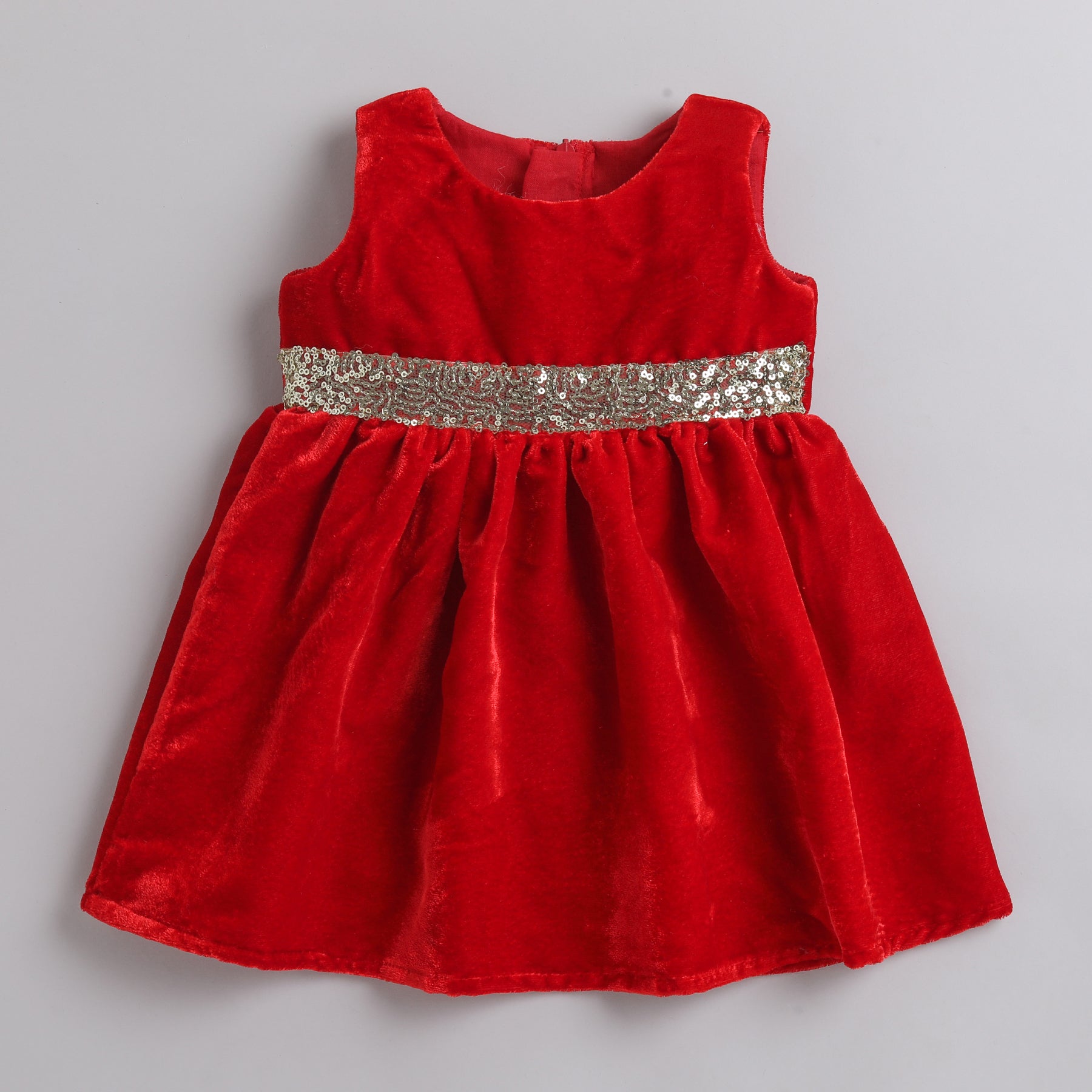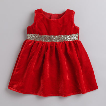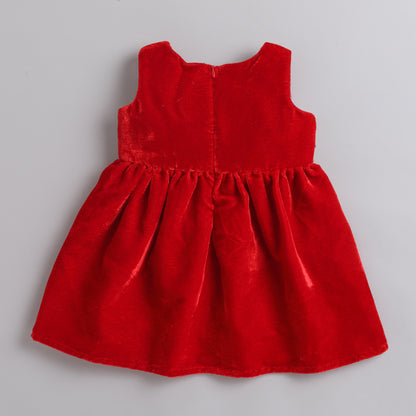 Many Frocks & Velvet Sleevless Lace Embellished Knee Length Flared Girls Party Dress -Red